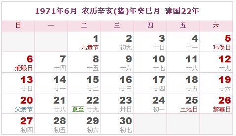 1971年6月 农历辛亥(猪)年癸巳月 建国22年