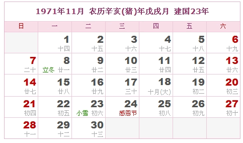 1971年11月 农历辛亥(猪)年戊戌月 建国23年