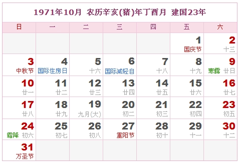 1971年10月 农历辛亥(猪)年丁酉月 建国23年