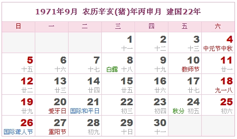1971年9月 农历辛亥(猪)年丙申月 建国22年