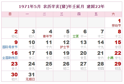 1971年5月 农历辛亥(猪)年壬辰月 建国22年
