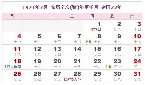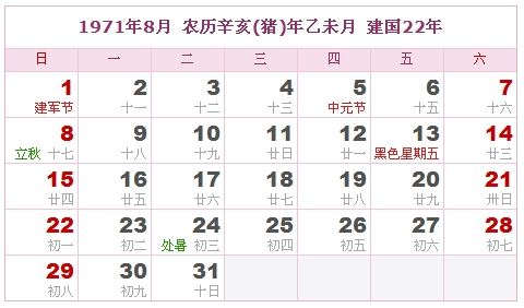 1971年8月 农历辛亥(猪)年乙未月 建国22年