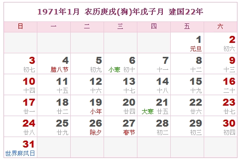 1971年1月 农历庚戌(狗)年戊子月 建国22年