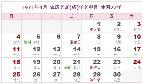 1971年4月 农历辛亥(猪)年辛卯月 建国22年