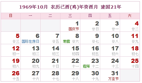1969年10月 农历己酉(鸡)年癸酉月 建国21年