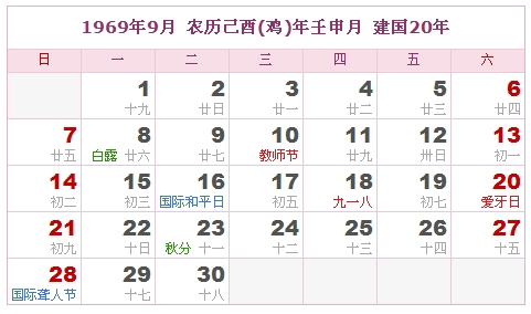 1969年9月 农历己酉(鸡)年壬申月 建国20年