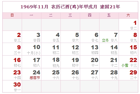 1969年11月 农历己酉(鸡)年甲戌月 建国21年