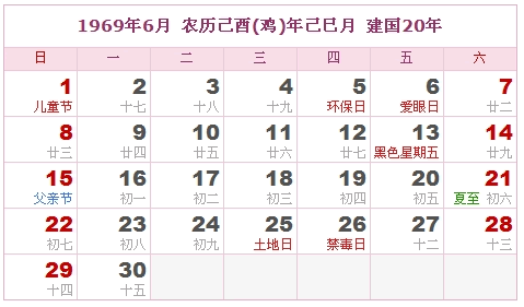 1969年6月 农历己酉(鸡)年己巳月 建国20年