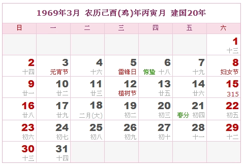 1969年3月 农历己酉(鸡)年丙寅月 建国20年