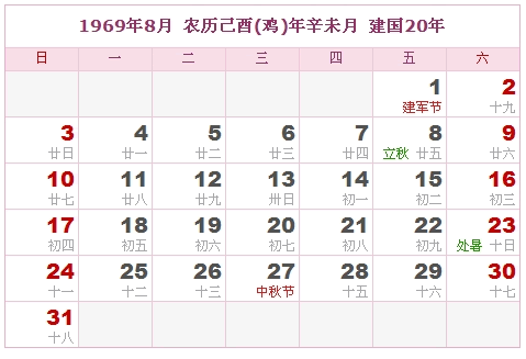 1969年8月 农历己酉(鸡)年辛未月 建国20年