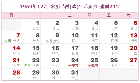 1969年12月 农历己酉(鸡)年乙亥月 建国21年
