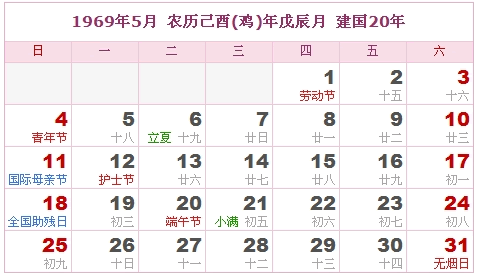 1969年5月 农历己酉(鸡)年戊辰月 建国20年