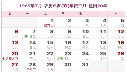 1969年7月 农历己酉(鸡)年庚午月 建国20年