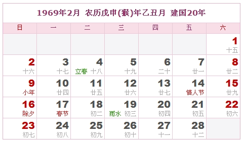 1969年2月 农历戊申(猴)年乙丑月 建国20年