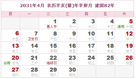 2031年4月 农历辛亥(猪)年辛卯月 建国82年