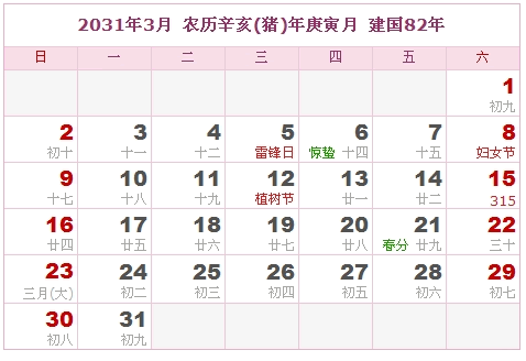 2031年3月 农历辛亥(猪)年庚寅月 建国82年