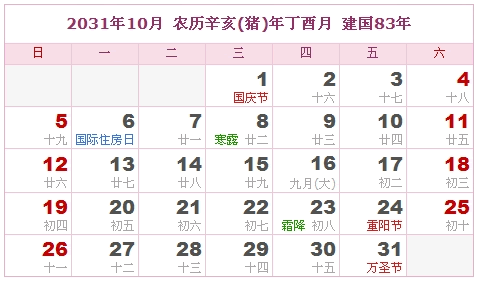 2031年10月 农历辛亥(猪)年丁酉月 建国83年