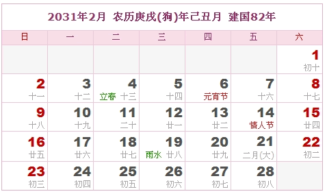 2031年2月 农历庚戌(狗)年己丑月 建国82年