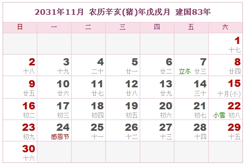 2031年11月 农历辛亥(猪)年戊戌月 建国83年