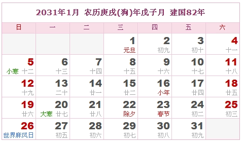 2031年1月 农历庚戌(狗)年戊子月 建国82年