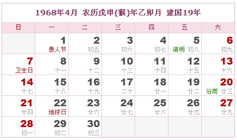 1968年4月 农历戊申(猴)年乙卯月 建国19年