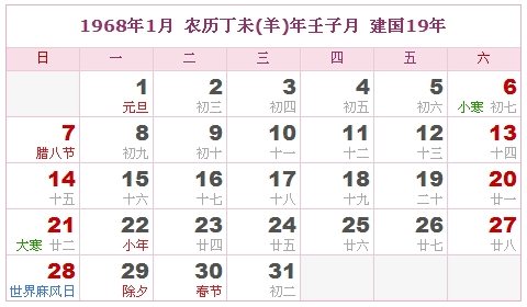 1968年1月 农历丁未(羊)年壬子月 建国19年