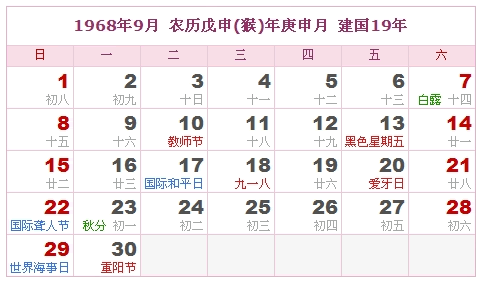 1968年9月 农历戊申(猴)年庚申月 建国19年