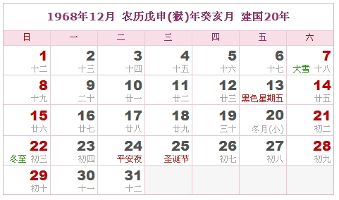 1968年12月 农历戊申(猴)年癸亥月 建国20年