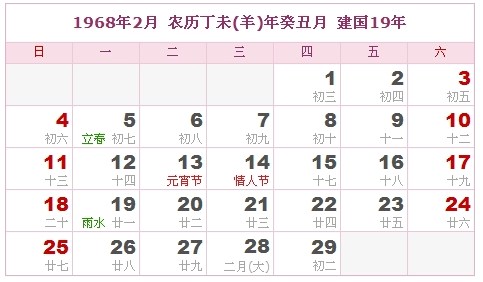 1968年2月 农历丁未(羊)年癸丑月 建国19年