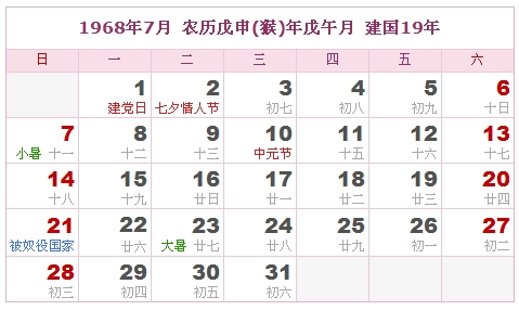 1968年7月 农历戊申(猴)年戊午月 建国19年