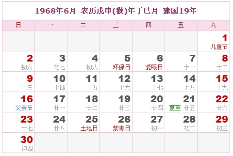 1968年6月 农历戊申(猴)年丁巳月 建国19年