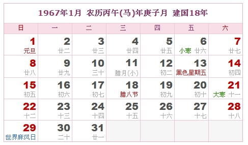 1967年1月 农历丙午(马)年庚子月 建国18年