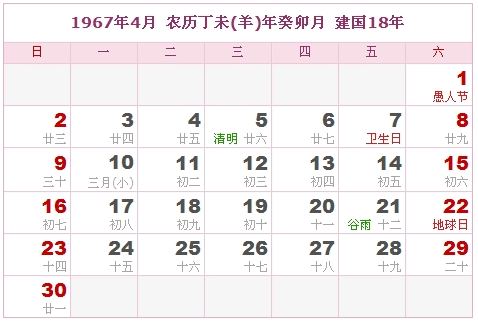 1967年4月 农历丁未(羊)年癸卯月 建国18年