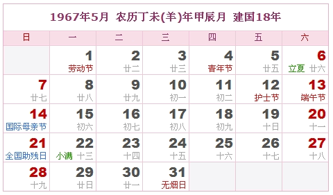 1967年5月 农历丁未(羊)年甲辰月 建国18年