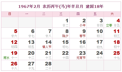 1967年2月 农历丙午(马)年辛丑月 建国18年