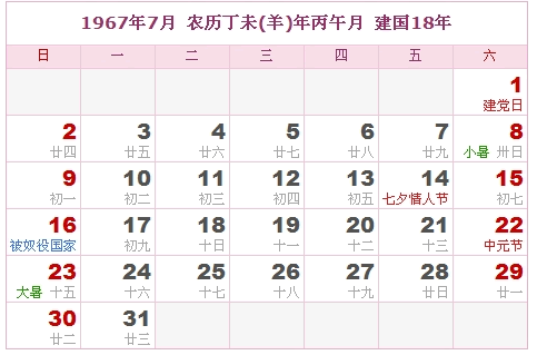 1967年7月 农历丁未(羊)年丙午月 建国18年