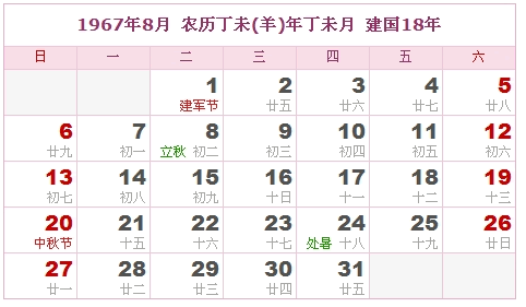 1967年8月 农历丁未(羊)年丁未月 建国18年