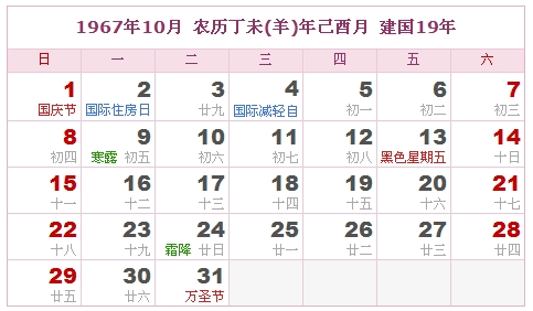 1967年10月 农历丁未(羊)年己酉月 建国19年