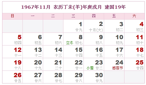 1967年11月 农历丁未(羊)年庚戌月 建国19年