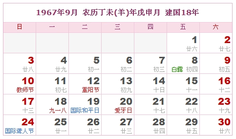1967年9月 农历丁未(羊)年戊申月 建国18年