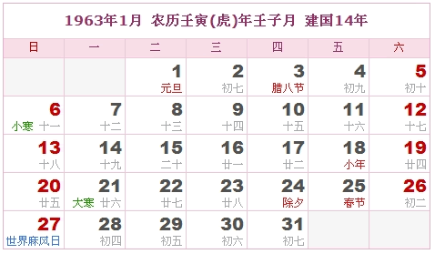 1963年1月 农历壬寅(虎)年壬子月 建国14年