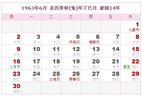 1963年6月 农历癸卯(兔)年丁巳月 建国14年