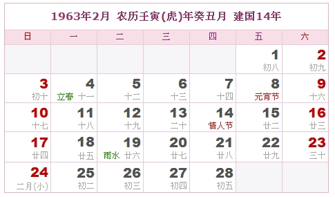 1963年2月 农历壬寅(虎)年癸丑月 建国14年