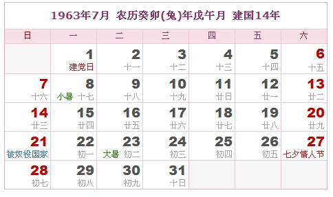 1963年7月 农历癸卯(兔)年戊午月 建国14年