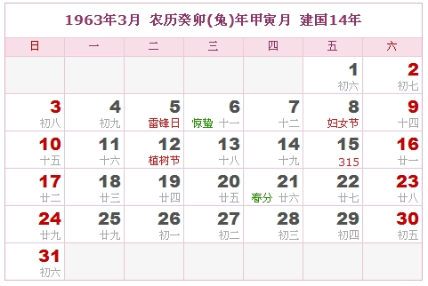 1963年3月 农历癸卯(兔)年甲寅月 建国14年