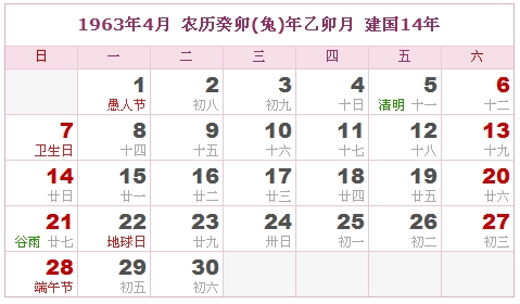 1963年4月 农历癸卯(兔)年乙卯月 建国14年