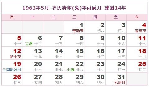1963年5月 农历癸卯(兔)年丙辰月 建国14年