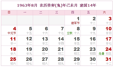 1963年8月 农历癸卯(兔)年己未月 建国14年