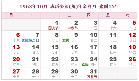 1963年10月 农历癸卯(兔)年辛酉月 建国15年