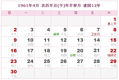 1961年4月 农历辛丑(牛)年辛卯月 建国12年